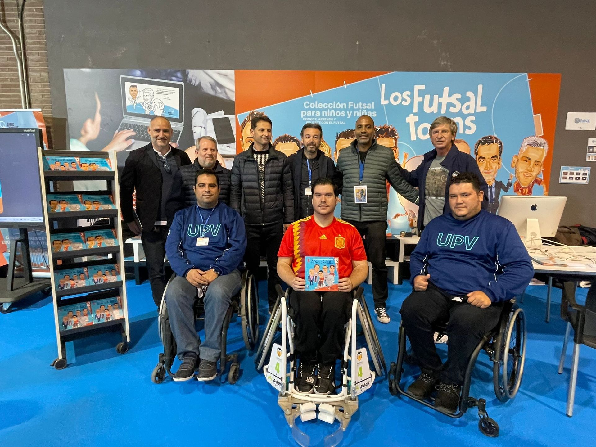 La FFPCV, con su presidente Miguel Montalbán y algunos de sus deportistas. El equipo A-ball UPV LENNOX de Fútbol en silla de ruedas. Rafa Zabala nos trajo el diseño en resina del muñeco Afric, protagonista de los cuentos de Futsal.